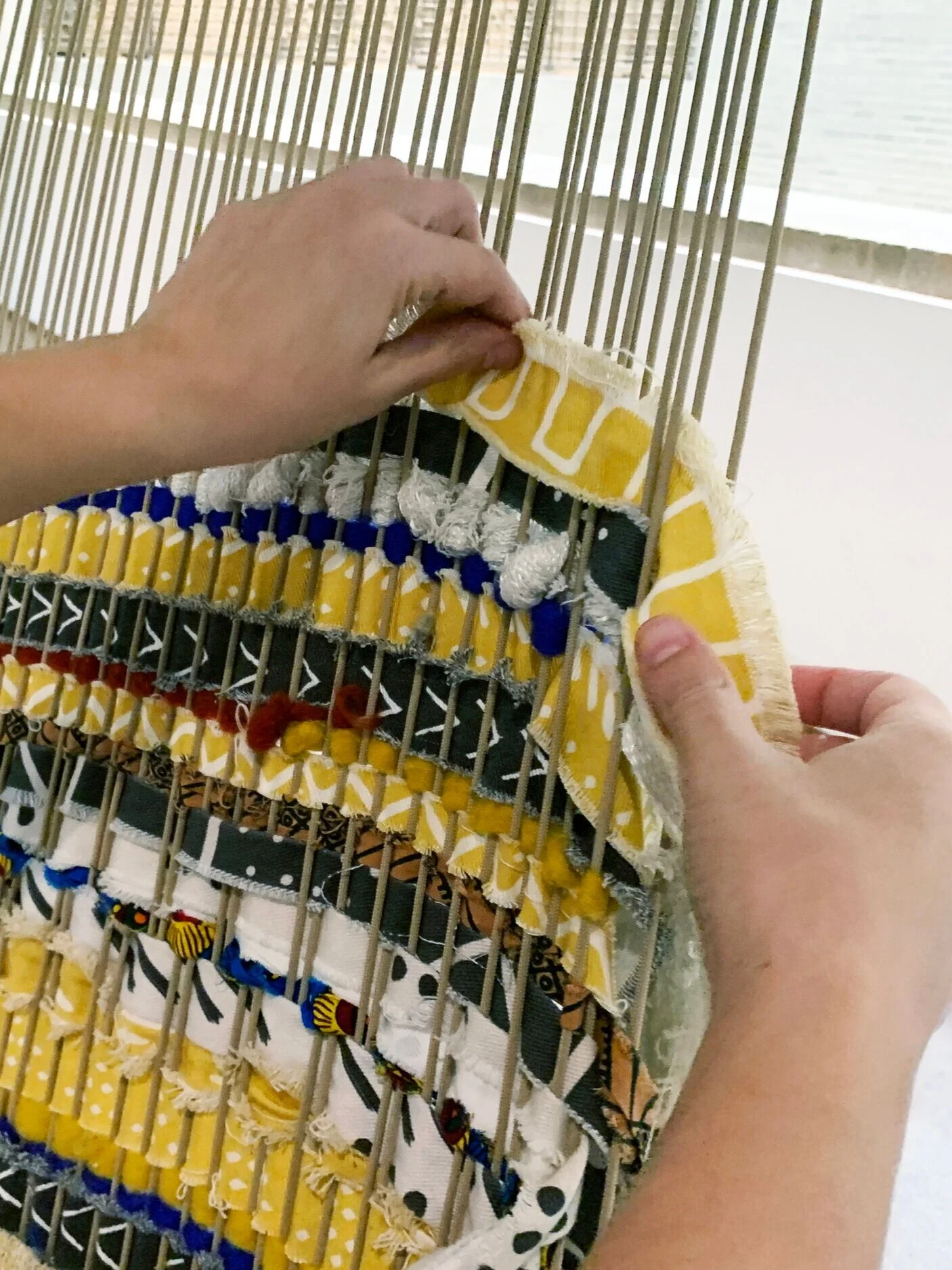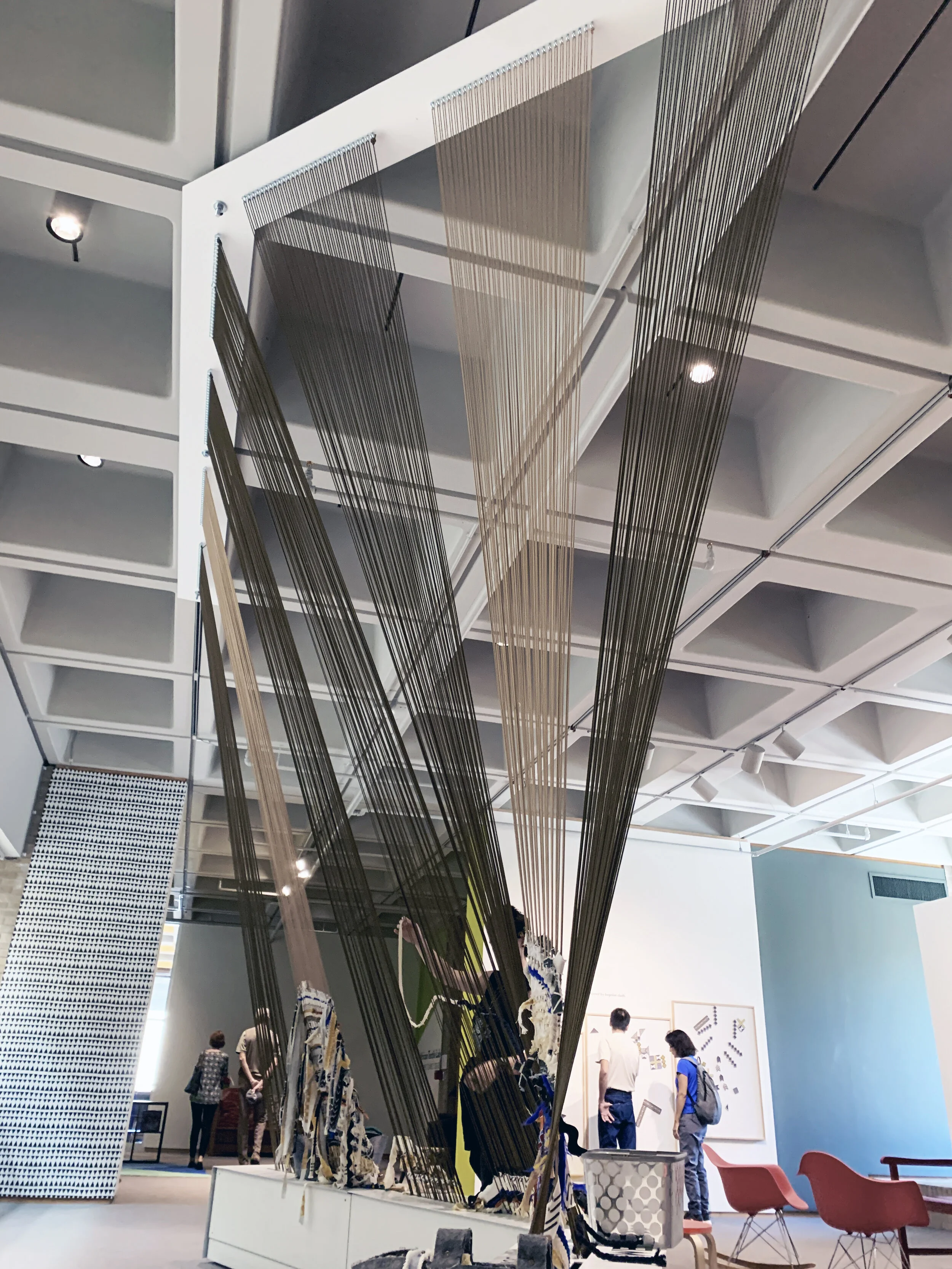 The Loom is an interactive educational sculpture installed in the Threads of Experience exhibition within the newly-expanded African Art Gallery at the North Carolina Museum of Art. The loom design is inspired by the 5 x 5 modulated concrete ceiling in the museum’s original Edward Durrell Building. Utilizing a simple geometric twisting, a static linear element becomes a captivating object in space. The chords are meant to be touched by visitors, who become active weavers of the sculpture.